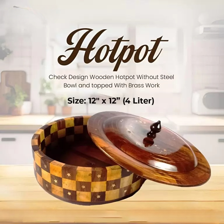 Check Design Handmade wooden hotpot made with pure natural wood and topped with Brass work.